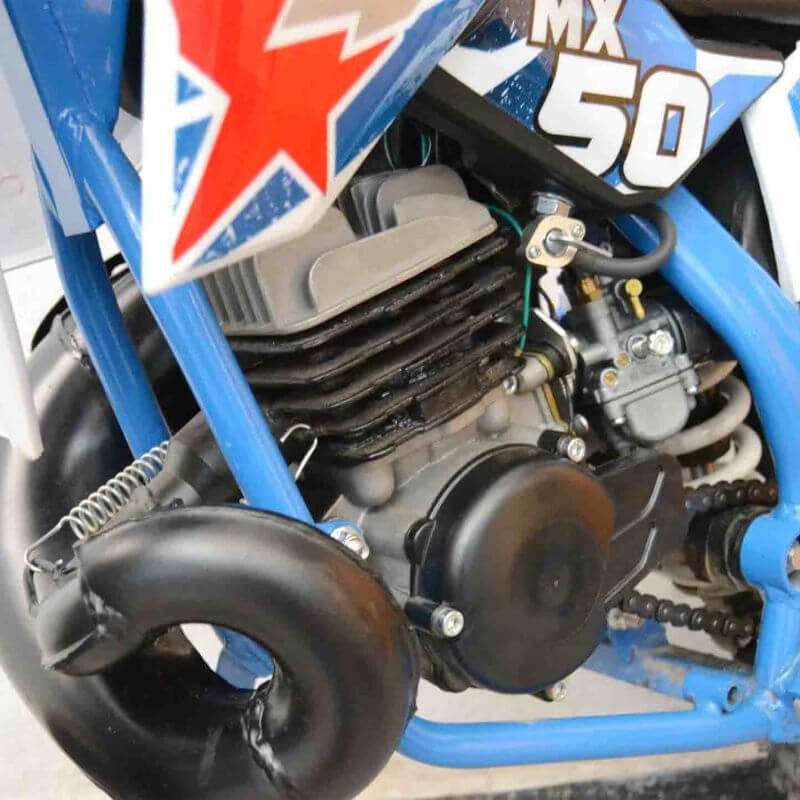 La nueva Pit Bike 50cc de IMR, la MX50 con un motor potente de 2 tiempos. Es un motor revolucionado (hasta 9500rpm) y exigente que requiere de una mezcla de aceite mayor a la normal, entre un 2.5-3% de aceite sintético de 2 tiempos mezclada con gasolina 95 o 98. Con una autonomía suficiente para para recorrer 15-20 Km gracias a su deposito de 1,5 litros.
