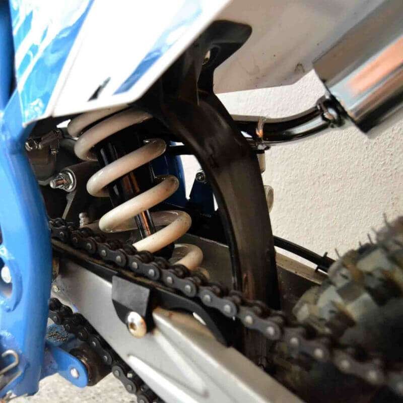Debido a las fuerzas que desarrolla la cadena de transmisión a la rueda es de paso 420, como las motos de 125cc. El tamaño de la cadena es mayor y más resistente que las miniMotos de iniciación. Otro detalle que nos recuerda a una moto de competición es el arranque con el pie por. Además de ser cómodo se puede arrancar mejor que con la mano y el tirador.