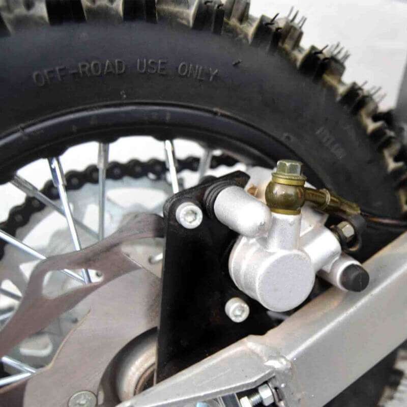 La distancia entre ejes es de 915mm para poder tener una buena estabilidad lineal a cierta velocidad y a la vez agil en las curvas. Es de las pocas mini Pit Bikes 50cc infanitles que monta suspensión delantera hidráulica y frenos de disco también hidráulicos delantero y trasero. El freno de la rueda trasera se acciona con la palanca del pie derecho como las motos de cross grandes.