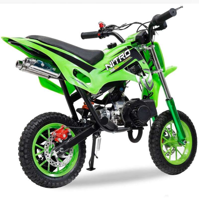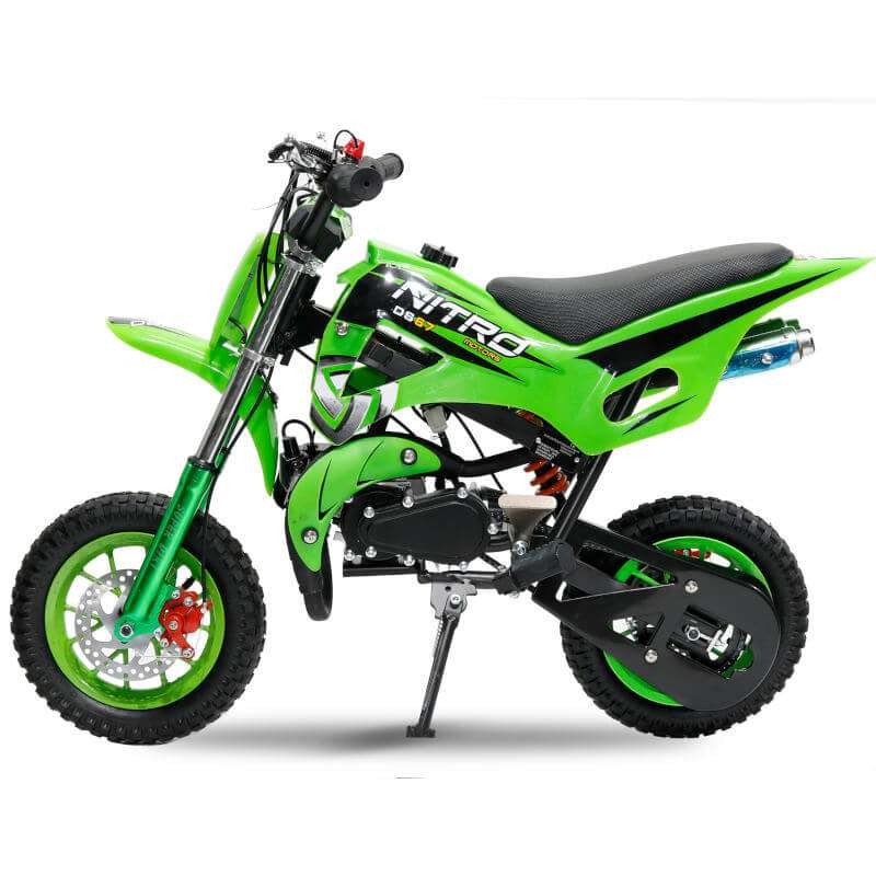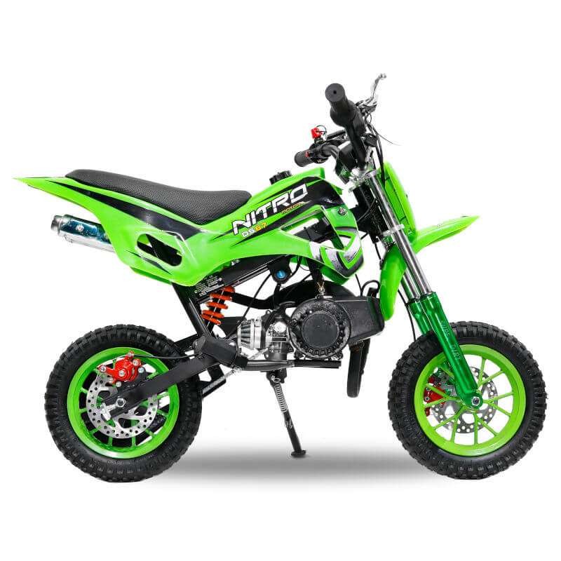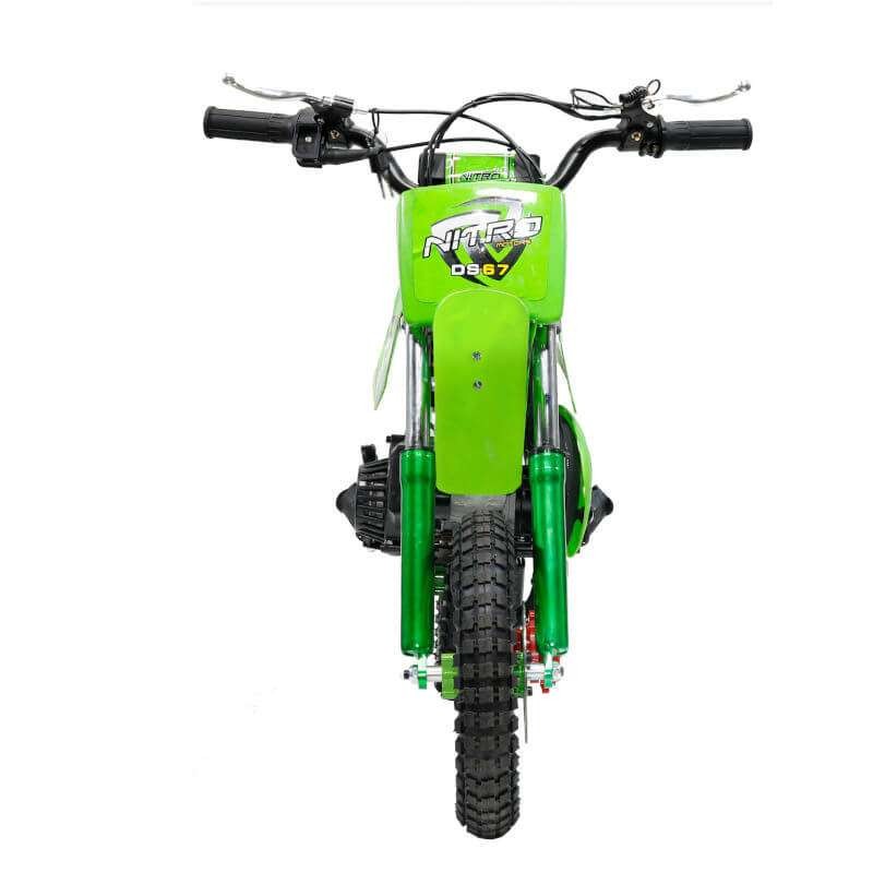 La miniMoto 49 DS67 enciende por tirador metálico, transmisión mediante campana con reductora corta para cadena gruesa h35. La miniMoto cross puede alcanzar una potencia de 2,5 KW, unos 3,5 CV. El sistema de frenado de la miniCross infantil es mediante disco tanto delantero como trasero. Su amortiguador y horquilla telescópica delantera hacen que sea en una buena moto infantil de campo. Los modelos de miniMotos de cross DS67 de Nitro Motors® se puede apreciar unas chasis de mayor calidad gracias a sus soldaduras reforzadas. Ademas esta miniCross dispone de un tubo de doble y varios acabados en aluminio. Otra de las mejoras observables son las estriberas de la miniCross que se han mejorado su estética y funcionalidad.